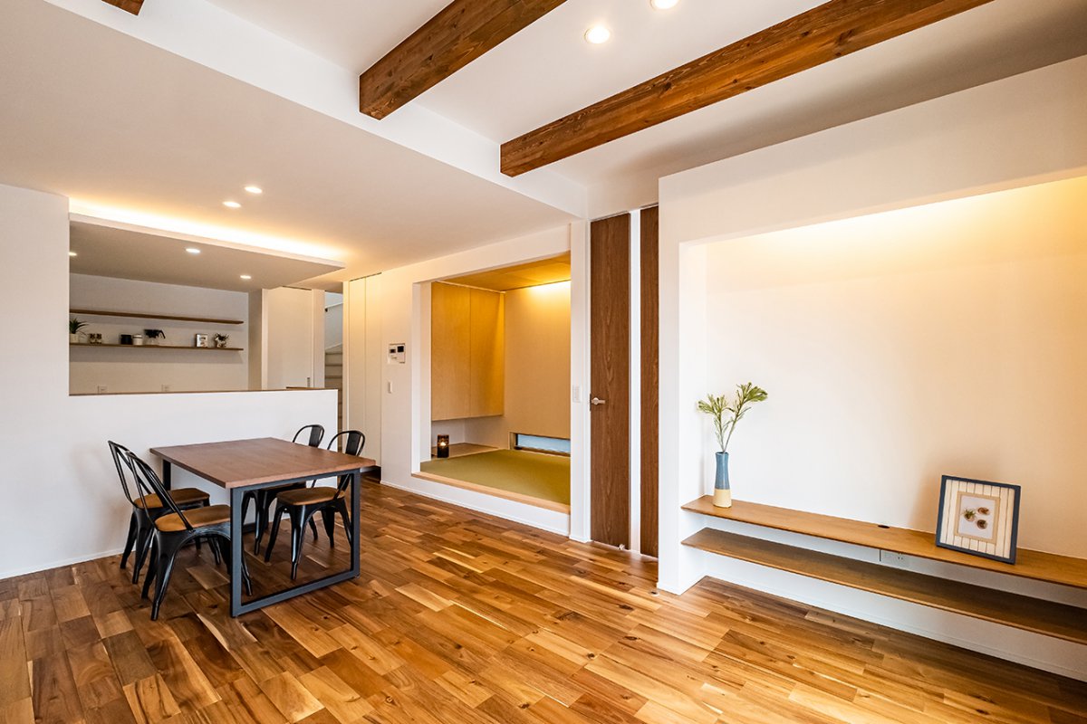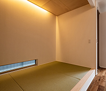 1階のリビングには、家族の団らんを大切にしながらも、多目的に活用できるタタミコーナーを設置。日常ではくつろぎの場として活用できるほか、来客時には客間としても利用できる柔軟な空間となっています。リビングとシームレスにつながることで、より広がりを感じる設計となっており、畳の持つ落ち着いた雰囲気が住まいに安らぎを与えます。