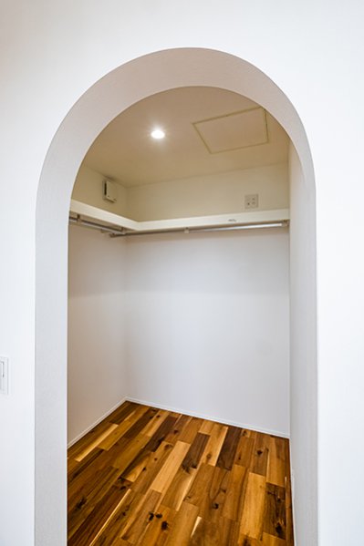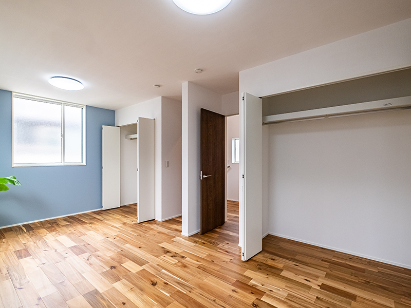 子ども部屋は2間続きの設計とし、成長に合わせて将来的に間仕切りを設けることで、2部屋に分けられる仕様に。小さいうちは広々としたプレイスペースとして、成長後は個室として活用できる、柔軟な間取りが特徴です。また、主寝室には大容量のウォークインクローゼットを設置。衣類や生活用品をスッキリ収納できるため、居室空間を広々と使えます。各居室にも十分な収納を確保し、常に整った空間を保つ工夫が施されています。